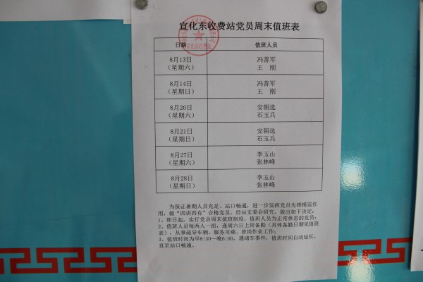 宣化東收費站制定黨員周末值班表