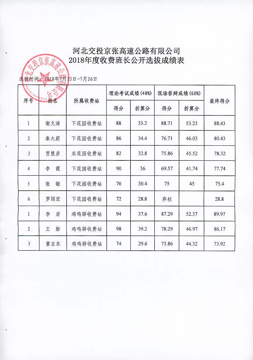 公司2018年收費班長公開選拔成績公示